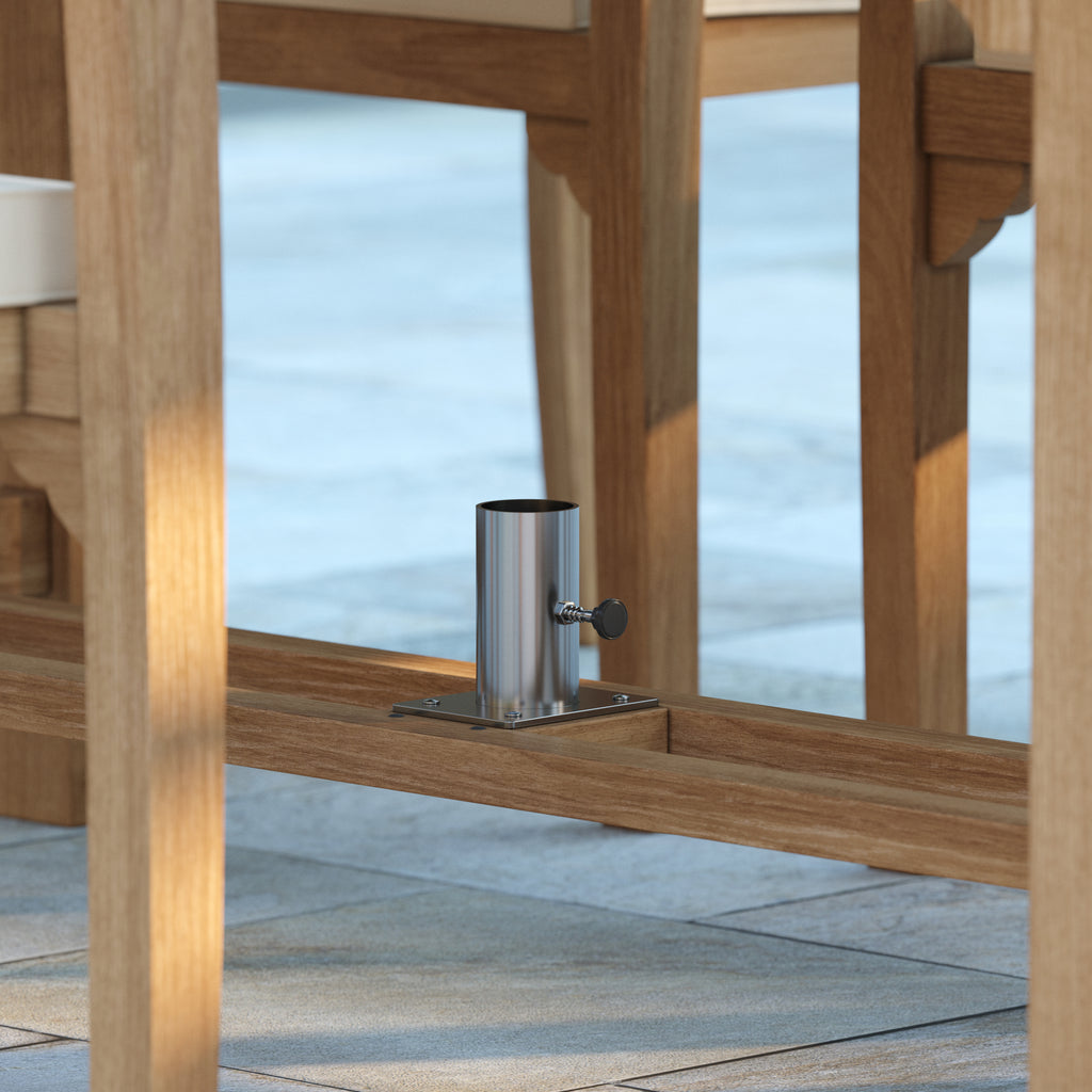 La table est pré-percée pour accueillir un mât de parasol épais et est fournie avec un support de parasol en teck parfaitement intégré. La table est finement poncée et présente une finition naturelle.